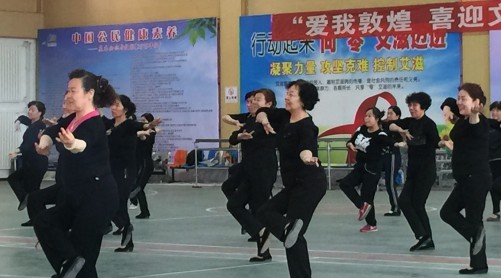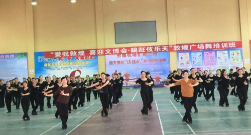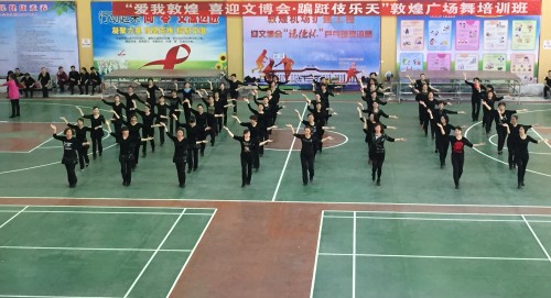 为喜迎首届丝绸之路(敦煌)国际文化博览会,传承弘扬敦煌古代舞蹈独特魅力,彰显敦煌传统文化历史精髓,4月22日,由敦煌市文联、敦煌市妇联、敦煌市文广局和敦煌市教育局联合举办的“爱我敦煌.喜迎文博会.翩跹伎乐天”敦煌广场舞第一期培训班汇报演出在敦煌市体育活动中心正式举行,来自城乡200余名妇女文艺骨干参加了首期7天的集中培训。