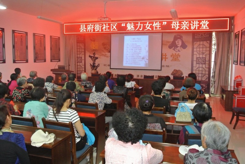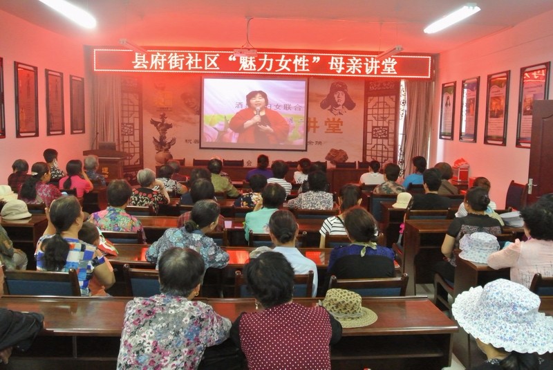 县府街社区以“爱与尊重.魅力女性”为主题,以“弘扬民族精神,发展公共文化,丰富妇女生活,提升母亲素质”为宗旨,组织社区留守妇女、居民群众观看了由周珏珉主讲的“爱与尊重.魅力女性”母亲讲堂专题片,开拓了一条高雅文化走进妇女、走进母亲生活的新途径,让母亲讲堂真正成为“母亲文化、母亲参与、母亲享用”的文化殿堂。