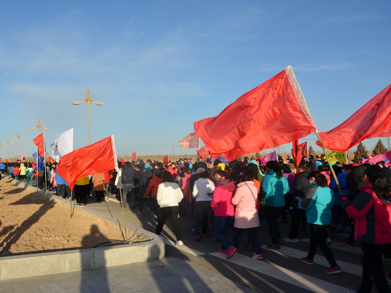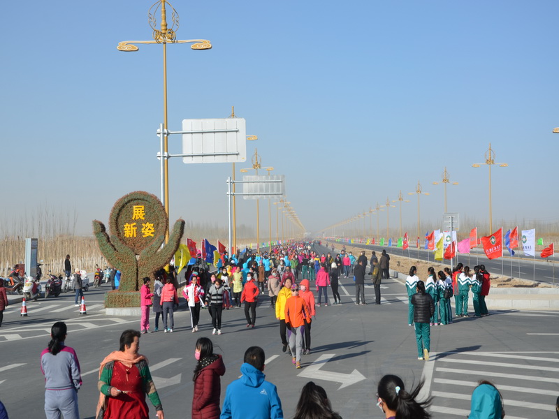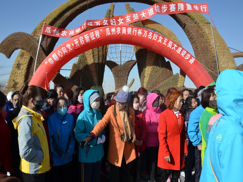 随着县委宋书记发令枪声的响起,近万名女干部职工、学生代表、个体工商户代表和妇女群众代表迈着矫健的步伐,从瓜州玄奘大道东端,开始徒步。
