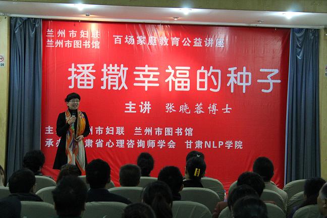 10月20日,兰州市“百场家庭教育公益讲座”《播散幸福的种子》在市图书馆成功举办。兰州市妇联副主席肖迎珺同志出席讲座并发表讲话,市图书馆党组书记张一平同志、市妇联少儿部部长杨香玲同志、市妇联下属的红山幼儿园和全体幼儿家长及教职工参加了讲座,培训班邀请了甘肃省心理咨询师学会、甘肃NLP学院张晓蓉博士为各位家长做了生动热情的讲解。