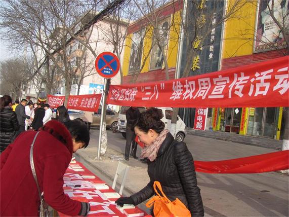 3月5日,红古区妇联联合区综治办、公、检、法、司、医疗卫生等部门,在供销联社门前举行了三八维权周宣传活动。
