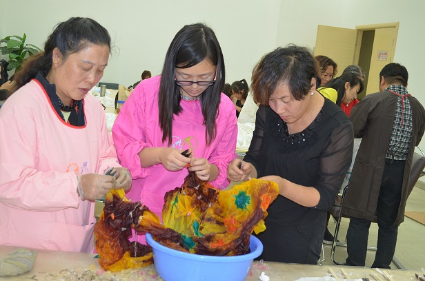 随后,管兰生和他的团队就染缬技能对妇联干部们进行了手把手技术传授和现场实训,并对手工绑扎完成的丝巾现场进行了染色工艺示范。妇联干部们对学习染缬技能热情高涨,对下一步开展“陇原巧手”培训工作充满了希望。