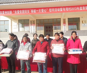 12月4日,临夏州妇联协调临夏市伊人百合美容养生女子会所、县妇保院,在临夏县新集镇寺湾村举行“关爱贫困妇女奉献一片爱心” 活动,为寺湾村贫困妇女发放慰问品,并对五好文明家庭、致富女能手、好婆婆、好儿媳进行了表彰奖励,县妇保站还为寺湾村广大妇女开展“母亲健康快车”义诊活动。