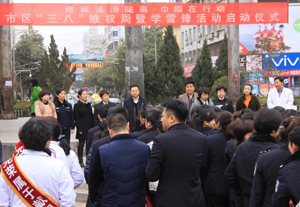 3月4日,陇南市、武都区妇联、文明办、公安局、检察院、法院、综治办、司法局、中医院、县医院等部门,联合在武都区盘旋路街心花园举行了以“建设法治陇南•巾帼在行动”为主题的2015年陇南市“三八”维权周暨学雷锋活动启动仪式。