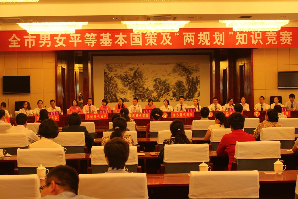 近日,庆阳市妇联举办了全市“男女平等基本国策及‘两规划’知识竞赛”。市政府副秘书长、市信访局局长贺立峰,陇东报社正县级编委李万里,市妇女儿童工作委员会委员、市妇联第三届执行委员会委员和热心观众共110多人观看了比赛。