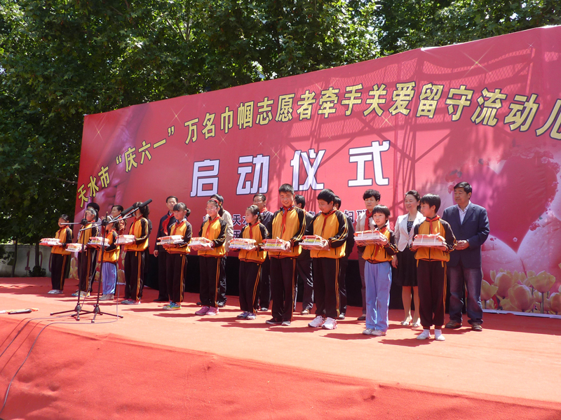 在启动仪式上,市人大副主任韩一兵为志愿者代表---桥南建材市场总经理郑秀芳授“巾帼志愿者”旗,巾帼志愿者代表市一幼园长巨慧宣读《“六一”牵手留守流动儿童志愿者倡议书》,市、区领导为留守流动儿童代表赠送了节日礼物。桥南建材市场、市建行、安利天水分公司、市中级人民法院、市一幼、市二幼、解放路幼儿园、聪聪星幼儿园、沐蕾俱乐部、秦州区人社局、林业局、综合执法局等12支巾帼志愿者代表与220名留守流动儿童结成了帮扶对子,互相交换了爱心卡,捐赠了价值3.2万元的现金和物品。爱心志愿者们的善举温暖着每一个留守流动儿童的心。