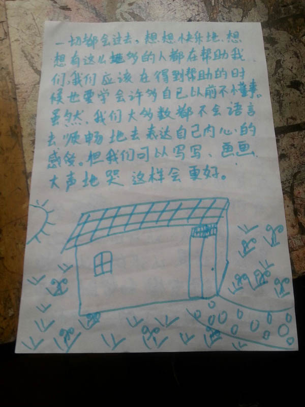 心理咨询师李艳艳、李一萍通过抓手指、心有千千结、爱心接力、拍手游戏、争当勇敢的灾区小卫士、画画等活动,缓解妇女儿童的焦虑情绪,鼓励她们走出阴影,关心身边人,关心身边事,积极行动起来,用爱搭建新的家园。鼓励孩子们做力所能及的事,帮助家人和身边的人叠被子,整理床铺,打扫卫生,保持周围环境的整洁。