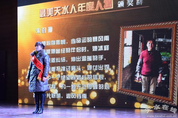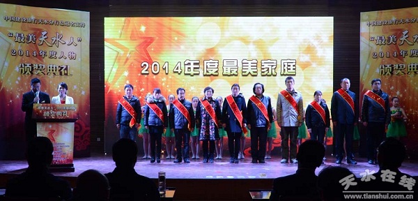 2月11日,“最美天水人”2014年度人物颁奖典礼隆重举行,来自全市各阶层的60名天水人心目中的“最美天水人”受到表彰。其中,“最美家庭”作为6类表彰类型之一,由市妇联推荐的15户“最美家庭”代表受到表彰,2人被评为2014年十大年度人物最高荣誉。