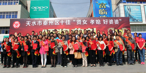 “5.15”国际家庭日之际,秦州区妇联、秦州区文明办、秦州区文广局联合在龙城广场举行了十佳“贤女孝媳好婆婆”评选表彰活动颁奖仪式,授予李小蕊等10位同志为秦州区“十佳贤女”、郑岚等10位同志为“十佳孝媳”、李玉花等10位同志为“十佳婆婆”荣誉称号,授予朱召梅等10户家庭为秦州区“十佳最美家庭”荣誉称号。秦州区委书记雷鸣出席颁奖仪式。