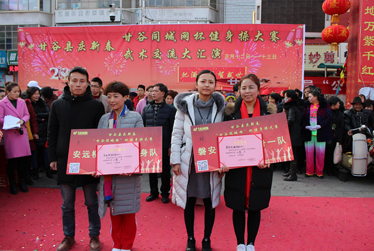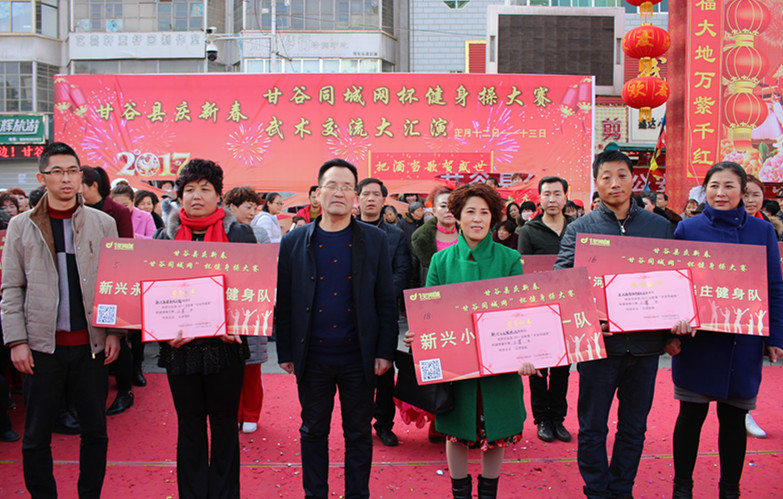 为践行十八届六中全会精神,2月8日,由县委宣传部主办、县妇联和县体育中心承办、甘谷同城网,甘谷同城三联公益广告公司协办的庆新春甘谷同城网杯健身操大赛在大什字文化广场隆重举行。县委常委宣传部部长张庆元、人大副主任王金生、政府副县长牛武军、政协副主席马清平以及妇联、体育中心负责人莅临指导并观看大赛,大赛经过前期海选后,来自全县各乡镇、社会团队的22队登台竞艺。