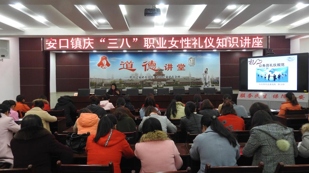 3月8日上午,副镇长赵蓉在镇机关四楼会议室向镇机关女干部职工讲解妇女健康知识,同时,为镇机关全体干部职工培训日常生活礼仪、公务礼仪等礼仪,现场示范礼仪要领。