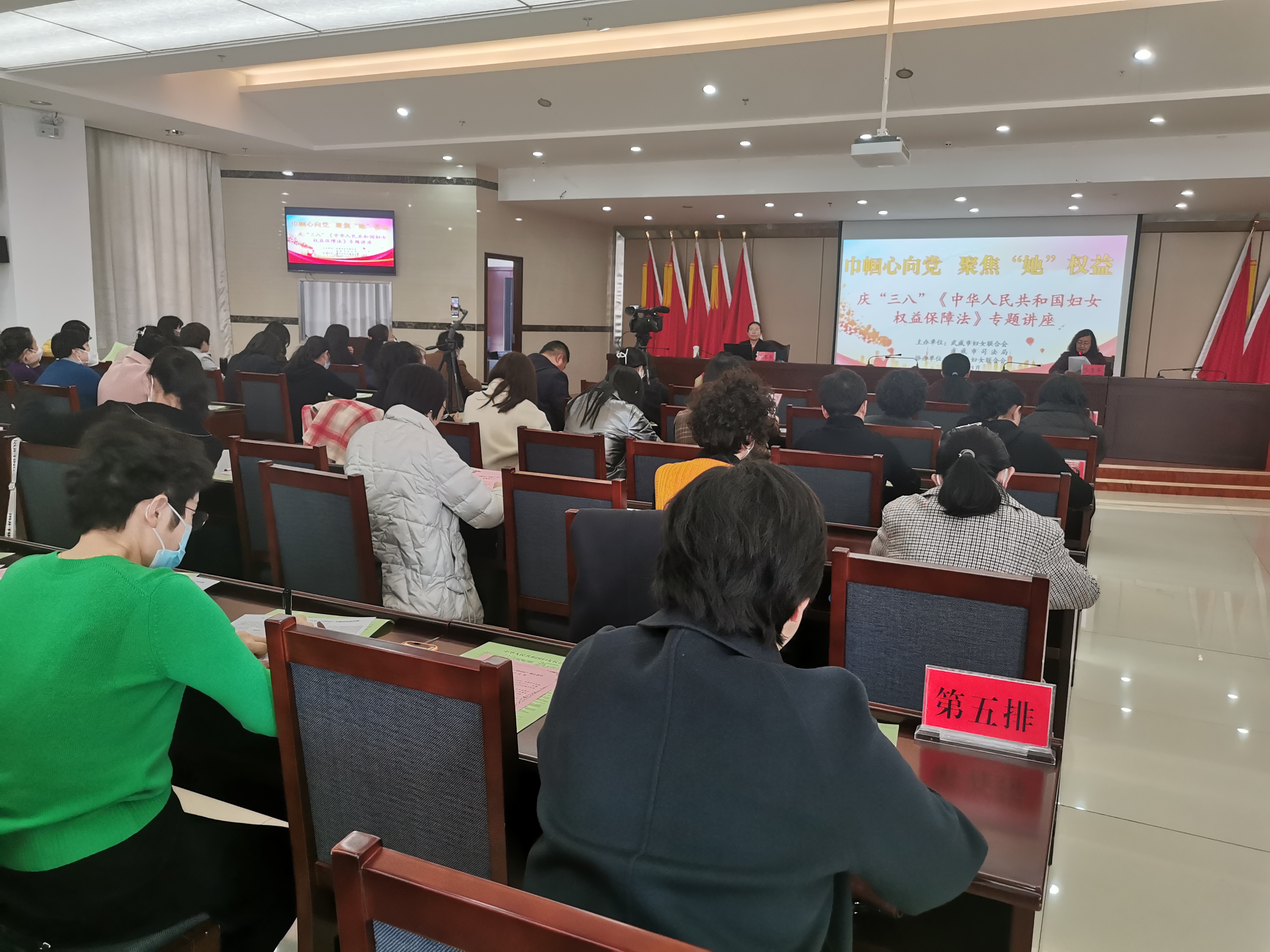 为深入学习贯彻党的二十大精神,深化“建设法治武威·巾帼在行动”活动,加大对新修订《中华人民共和国妇女权益保障法》的学习宣传普及,大力推动法律深入人心、落地生根,3月1日,市妇联、市司法局、凉州区妇联共同举办庆“三八”《中华人民共和国妇女权益保障法》专题讲座。市直各妇女组织负责同志、凉州区各街道妇联主席、部分网格员共150余人到场收听讲座。同时,此次讲座以线上直播的方式同步进行,3.5万人在线收听收看讲座。