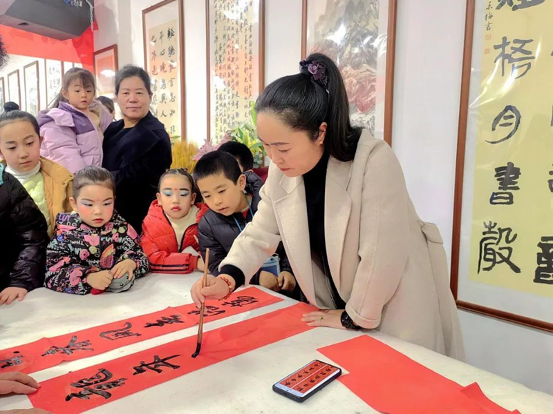 “来,我教你写一个福气满满的‘福’字,过年贴在自家大门上。”书法老师和孩子们共同执笔一起写“福”,在一笔一划中把浓浓的年味写出来,把美好的祝福送给孩子们。