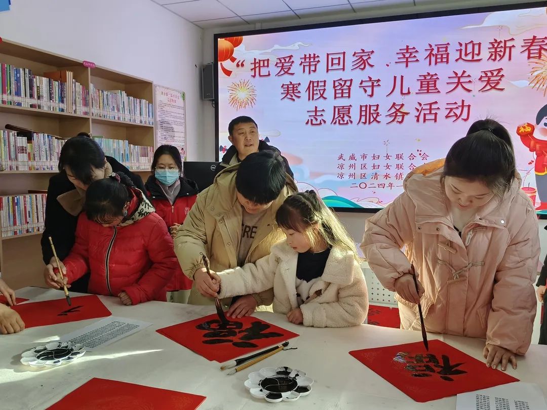 在民勤县母亲教育基地,“爱心妈妈”与孩子们一起朗诵、表演舞蹈、书写春联,把陪伴的幸福和温暖带给孩子们。