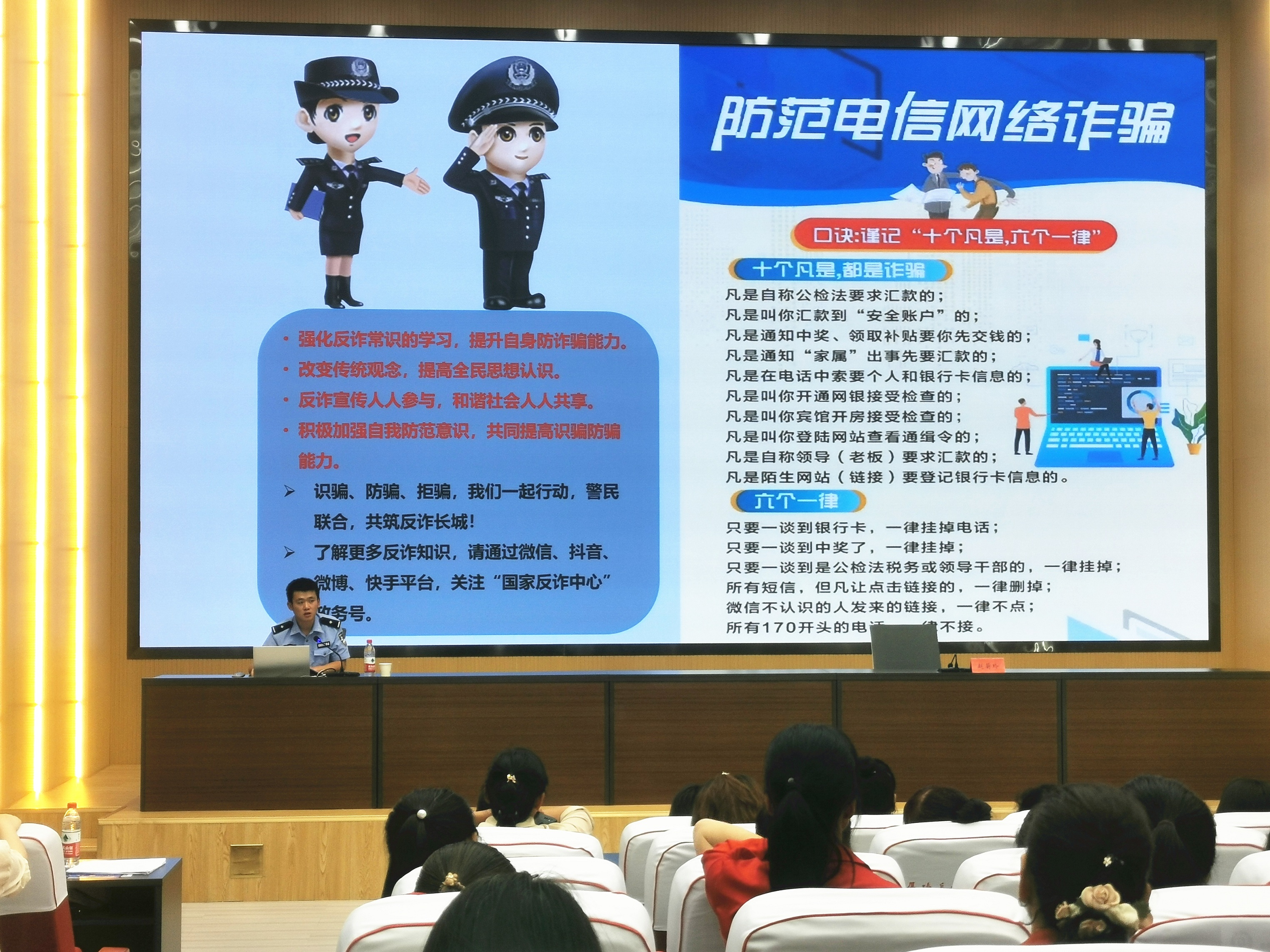 在全市“巾帼法律明白人”培训班上,公安民警围绕当前频发多发的网络贷款、刷单返利、冒充客服、假扮熟人、虚假投资理财等诈骗类型,结合视频播放、真实案例解析,深入具体地讲解防范电信网络诈骗的识破方法和技巧,教育引导妇联干部和妇女群众提高防范电信网络诈骗的意识和自我保护能力,共建安全和谐的社会环境。
