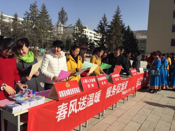 3月13日,由肃南县妇联、县人力资源和社会保障局等相关单位联合举办的“春风送岗位行动”宣传咨询活动在县城中心小广场隆重开展。县妇联在现场设立了宣传咨询点,协调联系旅游宾馆、生物公司等十余家企业,为女农牧民工、下岗女职工、女大学生提供了多个就业岗位,吸引了广大妇女群众,招聘、宣传活动现场气氛热烈,索要宣传资料的群众络绎不绝。