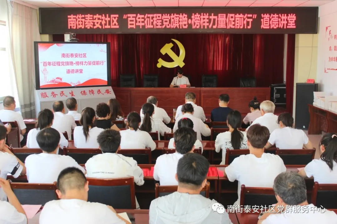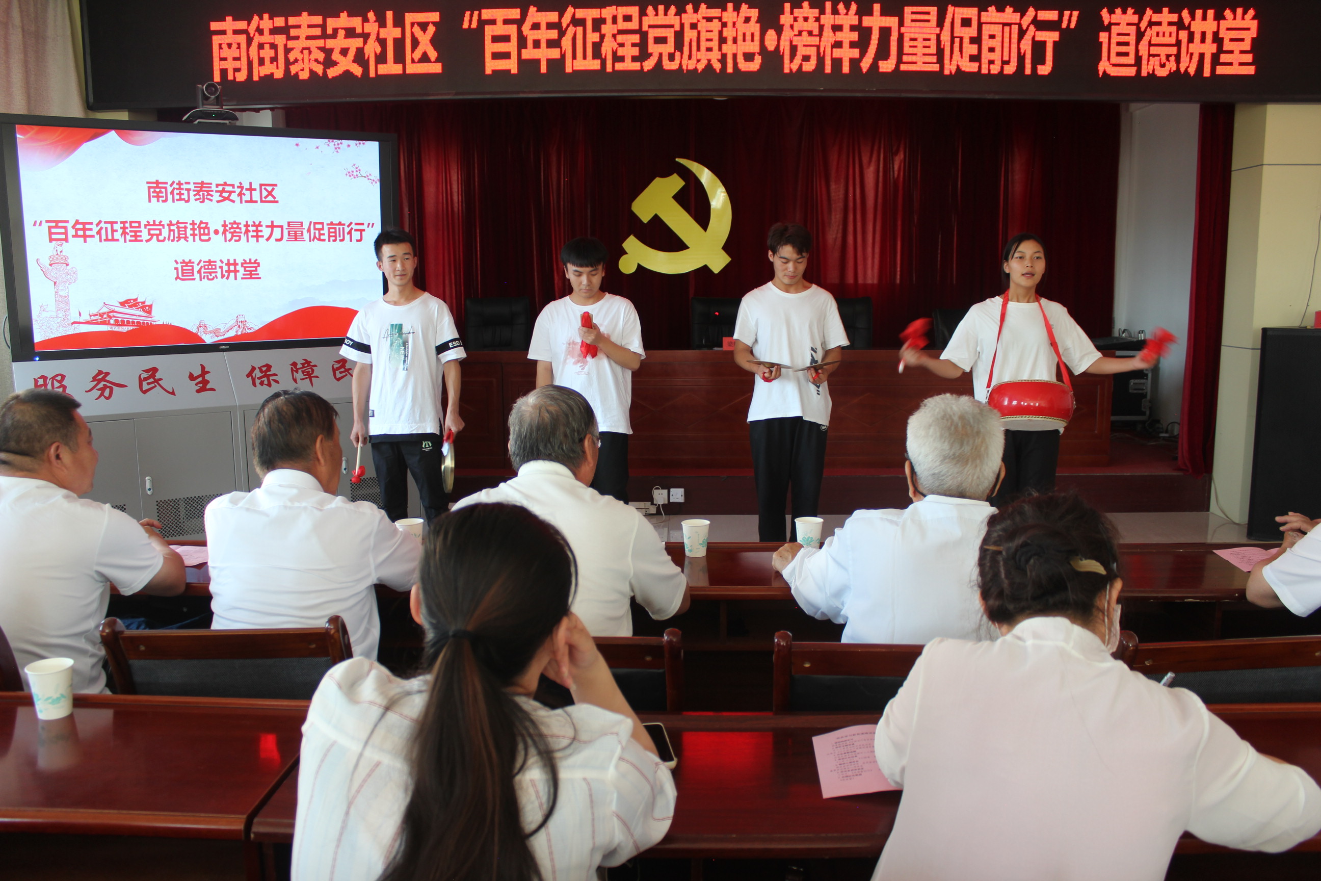 近日,南街泰安社区以道德讲堂为载体,以“百年征程党旗艳 榜样力量促前行”为主题举办了党史学习教育道德讲堂,共建单位张掖市人大党员代表、社区银发宣讲团成员、老兵宣讲团代表、党员居民代表、青年大学生代表、巾帼志愿者共计70余人参加了活动。